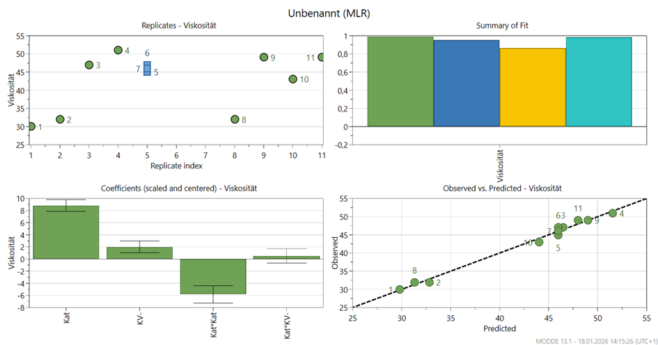 🔹 Replicates – Viskosität (oben links) : Zeigt die Reproduzierbarkeit an den Centerpoints (Versuche 5–7) – mit guter Konsistenz bei ~45–47. 👉 „Die Wiederholungen sind stabil – das Messsystem liefert zuverlässige Werte.“