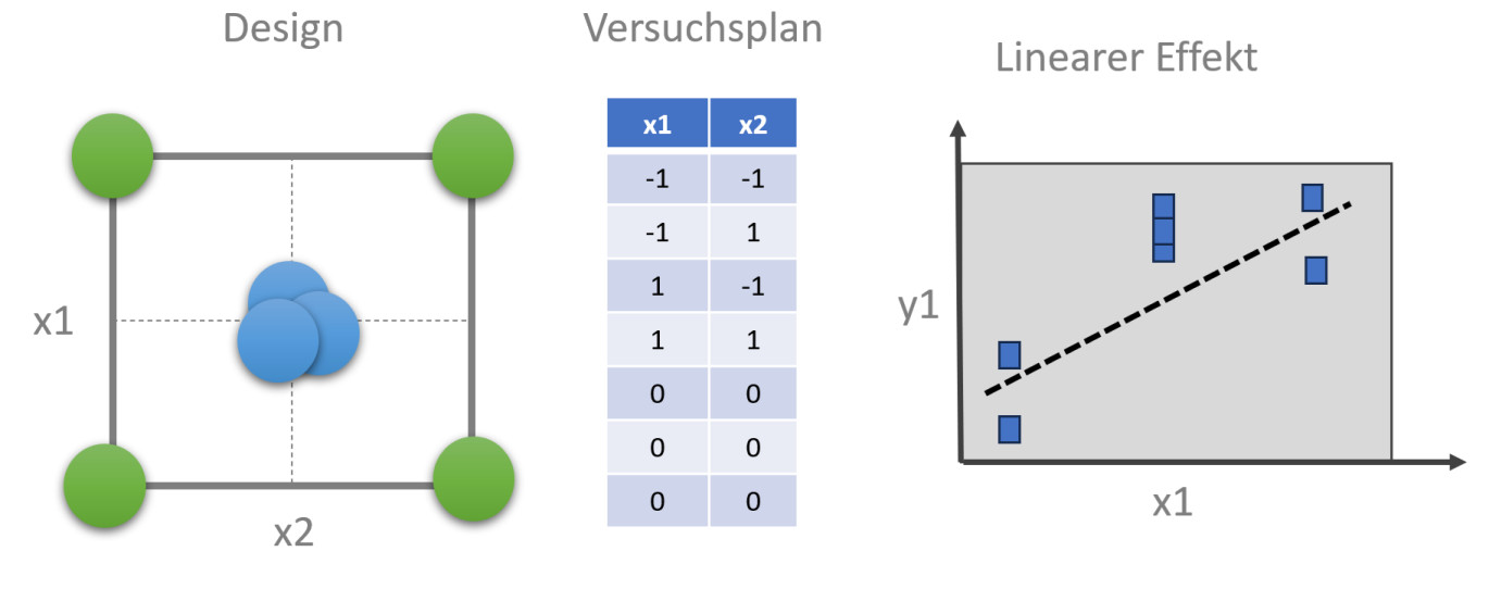 Analysieren wir solche Systeme mit einem klassischen vollfaktoriellen Screening-Design (lineare Effekte plus Wechselwirkungen), wird es schnell eng – für die Signifikanzgrenze und für die richtige Interpretation.