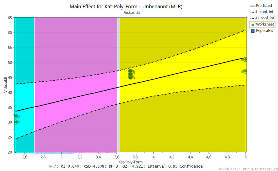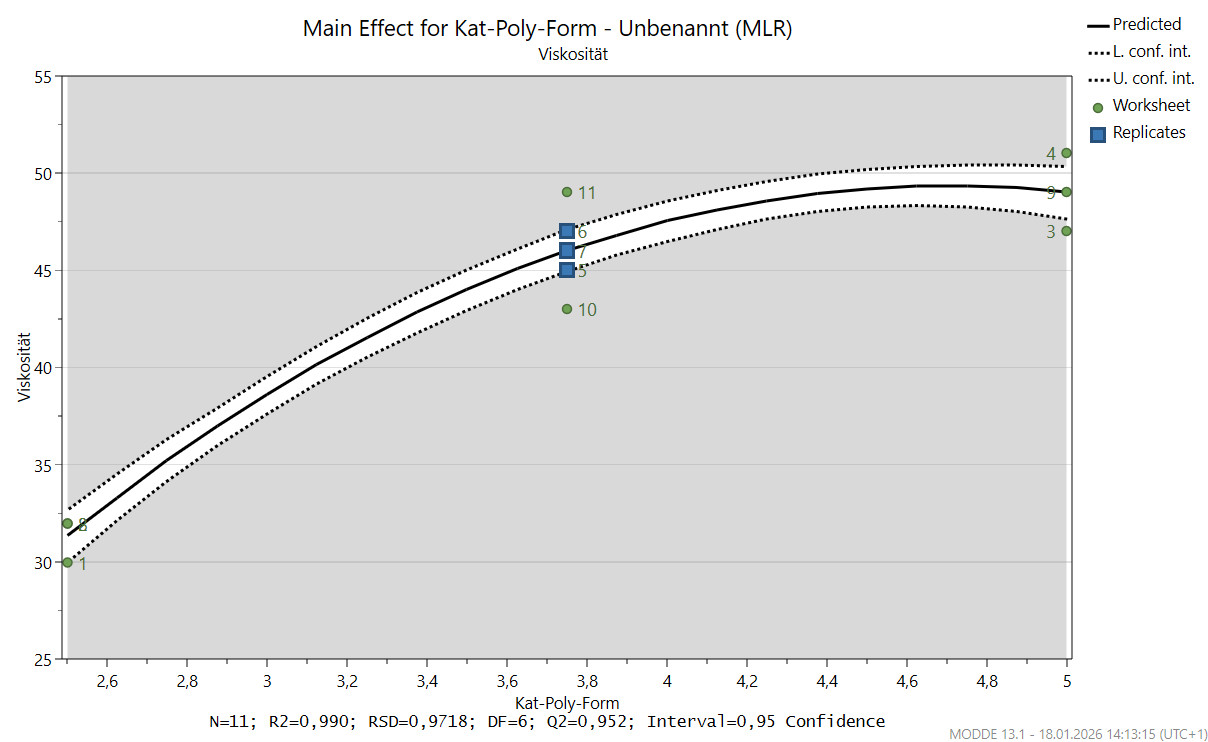 Der Main Effect Plot für den Katalysator zeigt sehr anschaulich, wo das lineare Modell an seine Grenzen stößt: