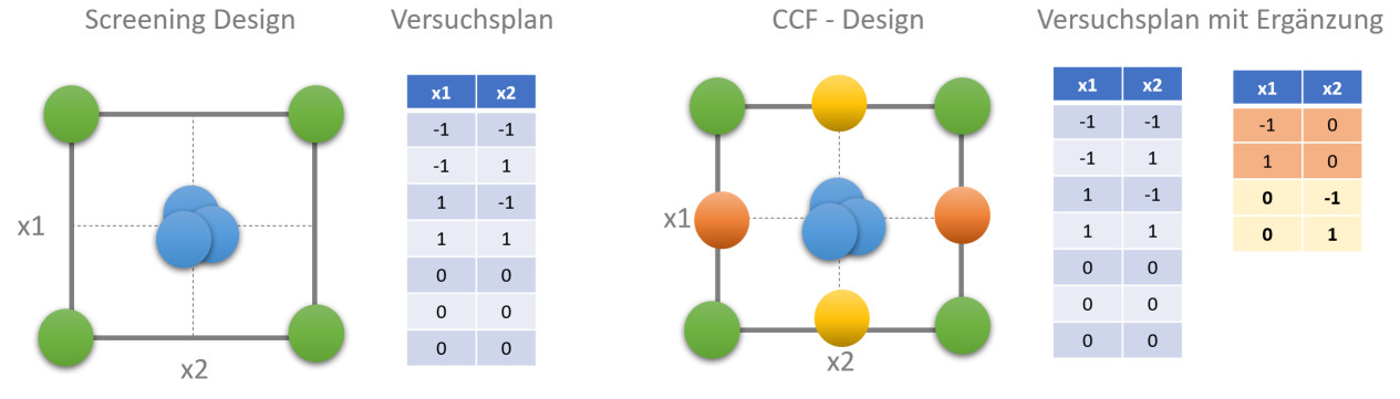 Durch die Erweiterung des Designs um zusätzliche mittlere Punkte – etwa in Form eines CCF-Designs (Central Composite Face-Centered) – kann das Modell diese Nichtlinearität erfassen.
